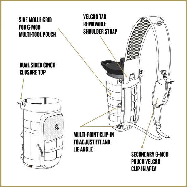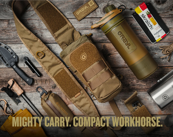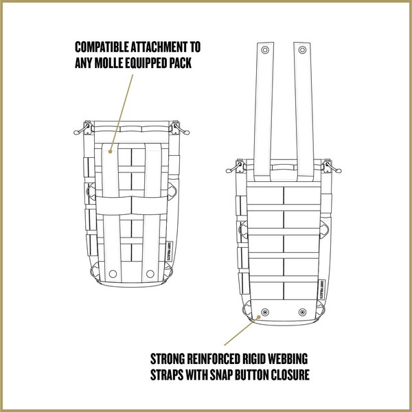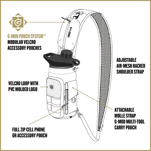 Our molle ridden Mission Bottle Sling is designed to carry any Grayl® Purifier Bottle and can handle most water bottles up to 40oz. Dual cinch top closures keep your bottle secure while on the move. Fully adjustable for left/right or front/back and it has multiple shoulder strap clip-in points to adjust the way your bottles lies on your back or front-side. The large full zip front pocket is designed for a smartphone or other essentials. Sidewalls are molle equipped to attach and carry smaller pouches.